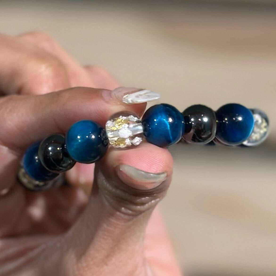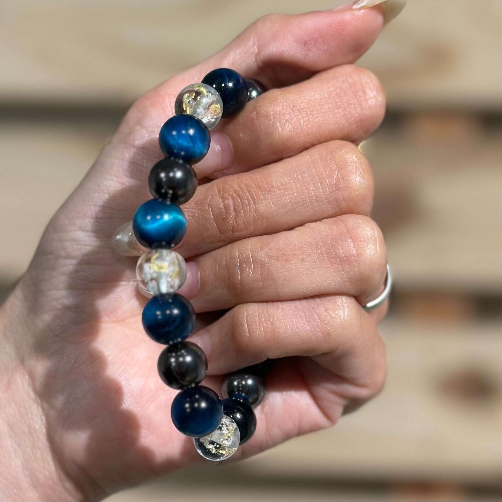 Tiger's Eye Blue: A symbol of strength. It inspires courage, deepens willpower, and helps the wearer overcome any challenge in life. Blue healing crystals are also known to promote communication, flow, mental clarity, and peace of mind.
