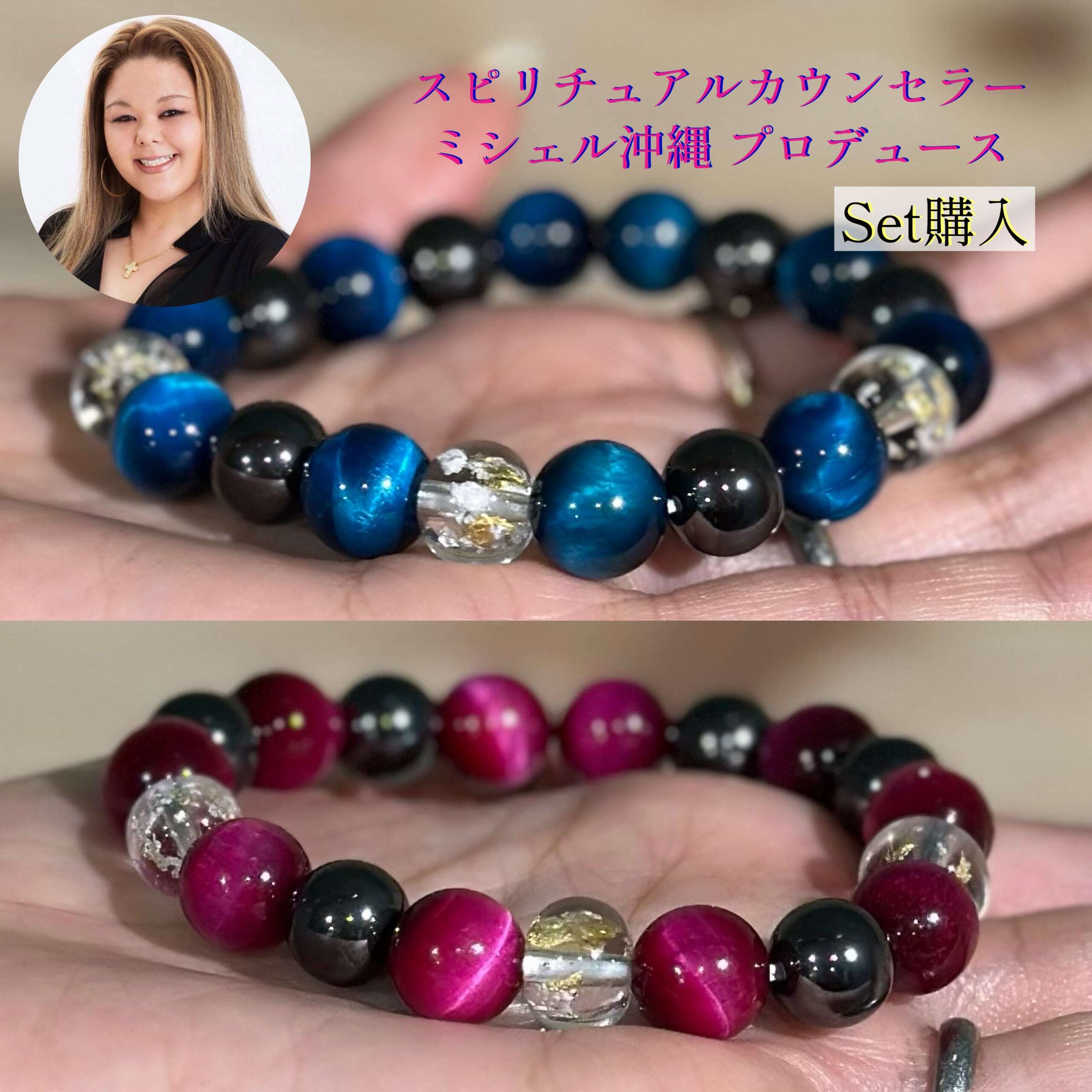 ★ミシェル×STARLANDコラボ★【セットでお得!】希少なタイガーアイのブルーとピンクを使用した、対人運・幸福度アップする沖縄龍神の御塩入りブレスレット