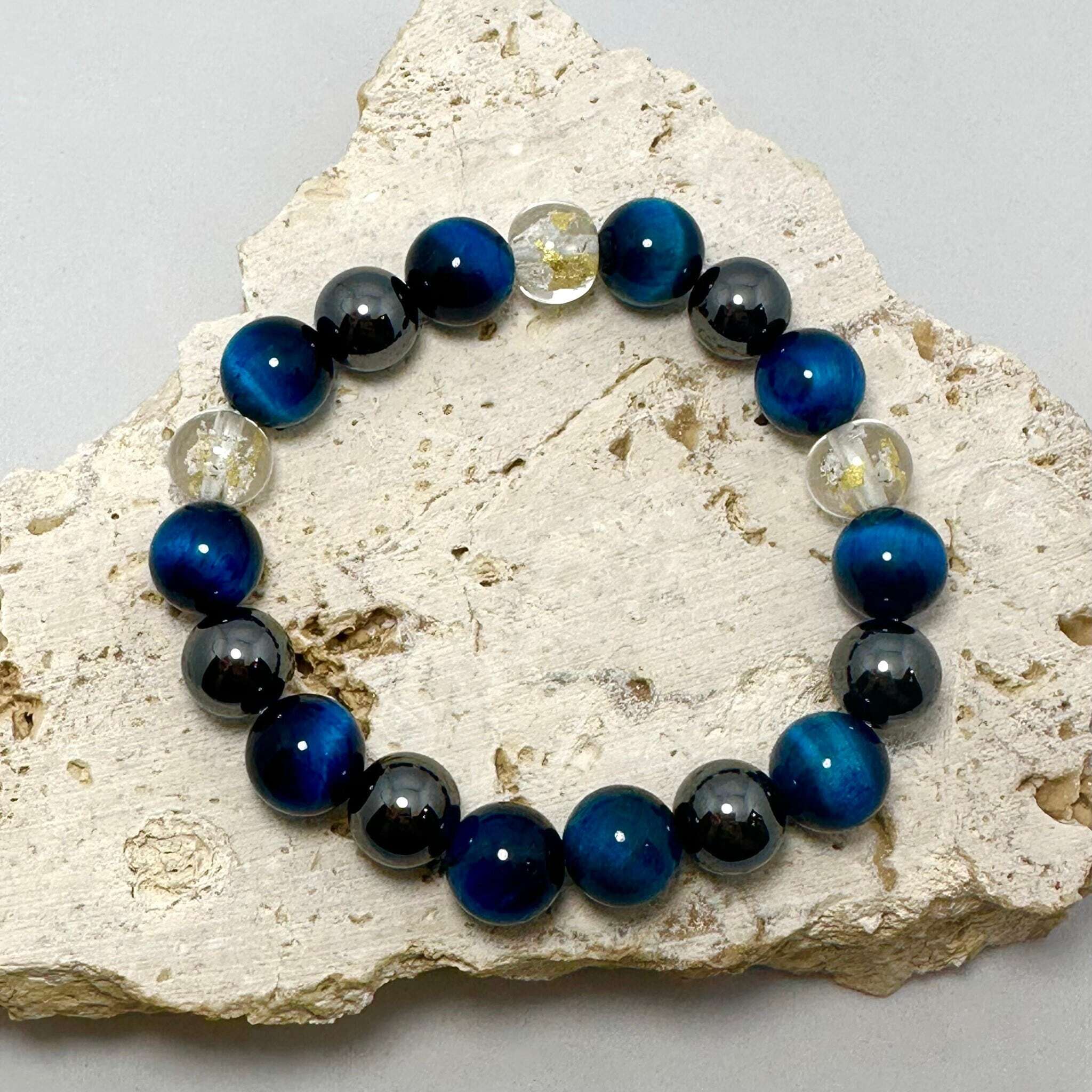 Tiger's Eye Blue: A symbol of strength. It inspires courage, deepens willpower, and helps the wearer overcome any challenge in life. Blue healing crystals are also known to promote communication, flow, mental clarity, and peace of mind.